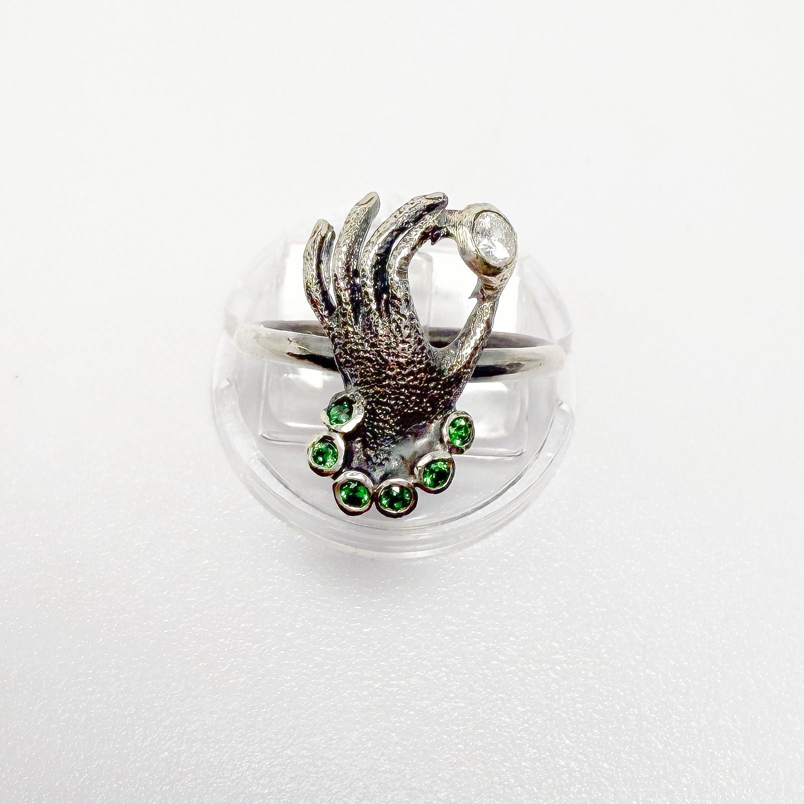 Es un anillo de plata envejecida con un diseño único y delicado. Representa una mano femenina, adornada con una pulsera de circonitas verdes que aporta un toque de color y sofisticación. Entre sus dedos, sostiene una circonita blanca brillante, que aporta luz y contraste al conjunto. El anillo combina detalle artesanal, elegancia y un aire místico, convirtiéndolo en una pieza que destaca por su originalidad y delicadeza.