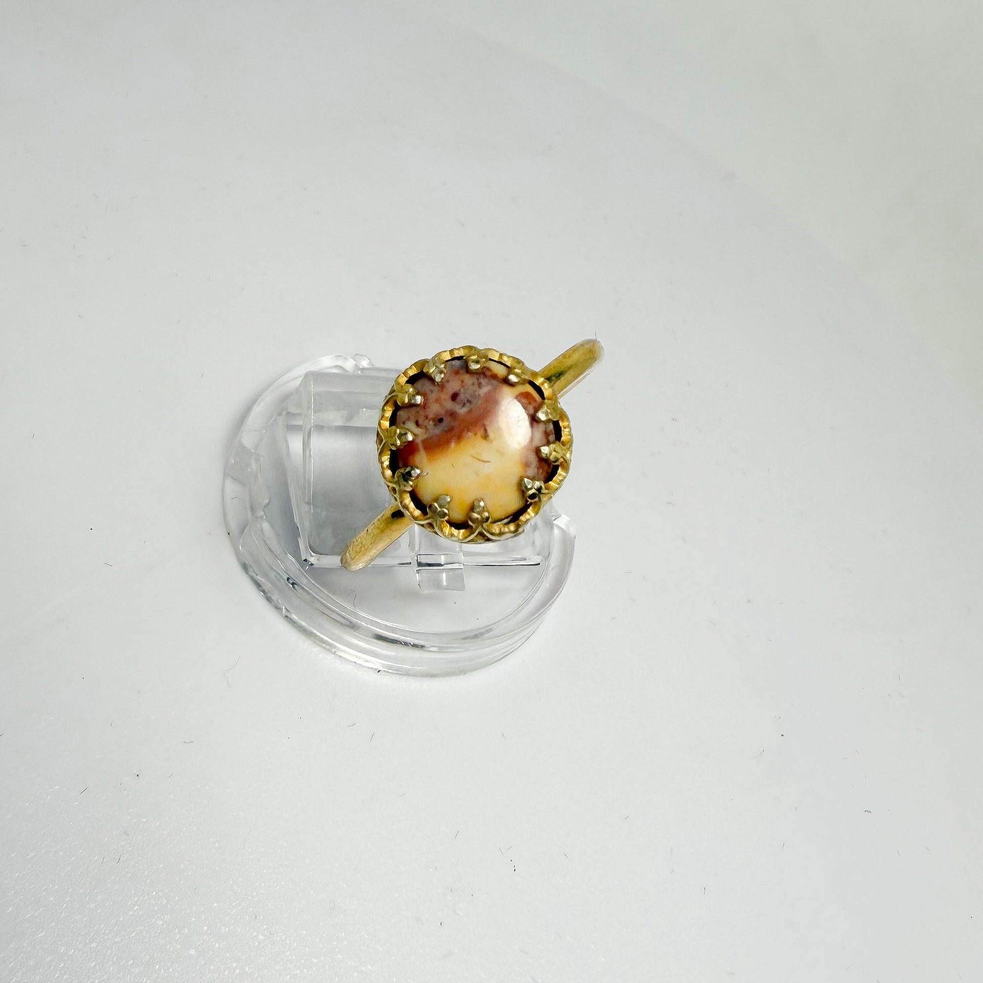 La piedra está engastada en un marco ornamental de estilo vintage, con un acabado tipo corona que aporta textura, elegancia y un toque distintivo. El baño de oro realza los matices cálidos de la piedra, creando una armonía visual perfecta.