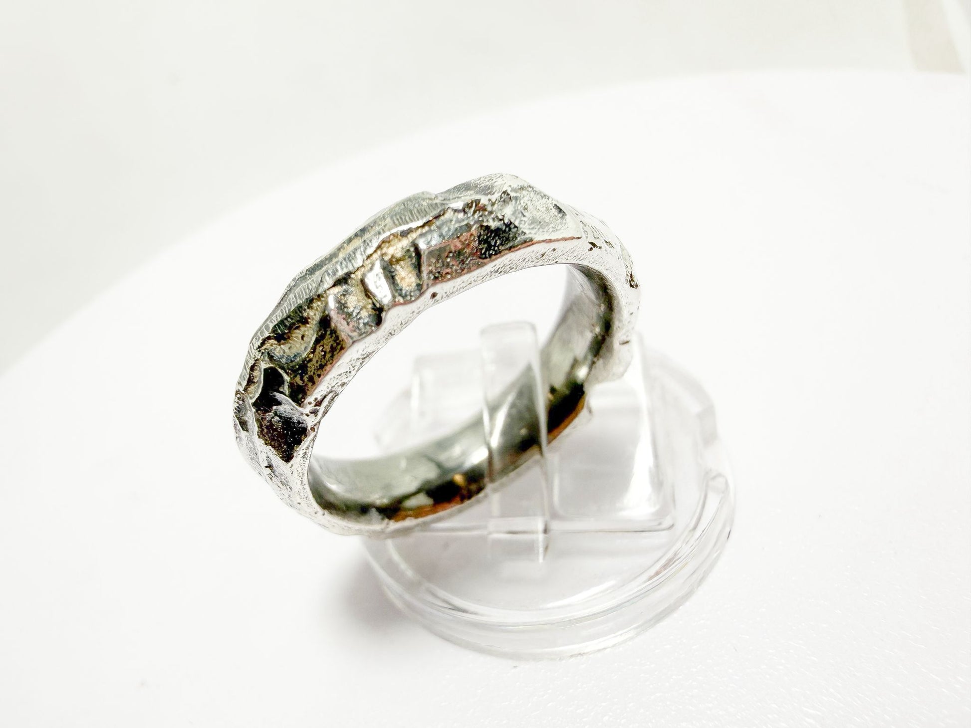 Anillo masculino de plata de ley 925 con diseño orgánico y carácter artesanal. Su superficie presenta una textura irregular y robusta, inspirada en formas naturales y paisajes erosionados, lo que le aporta una estética auténtica y contemporánea.