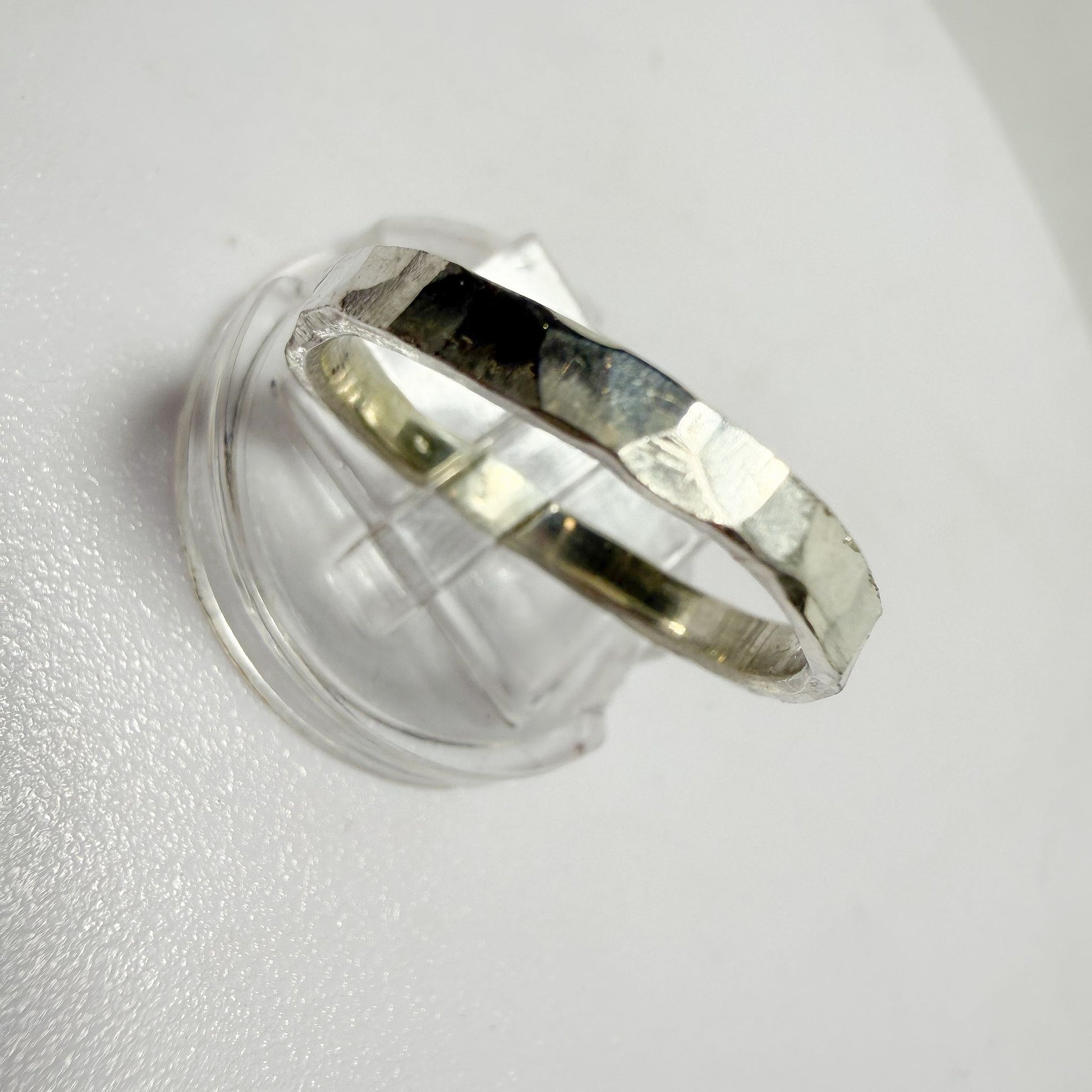 Anillo masculino de plata de ley 925 con diseño geométrico y acabado martillado a mano. Su superficie presenta facetas irregulares que capturan la luz desde distintos ángulos, creando reflejos sutiles y una estética contemporánea con carácter artesanal.
