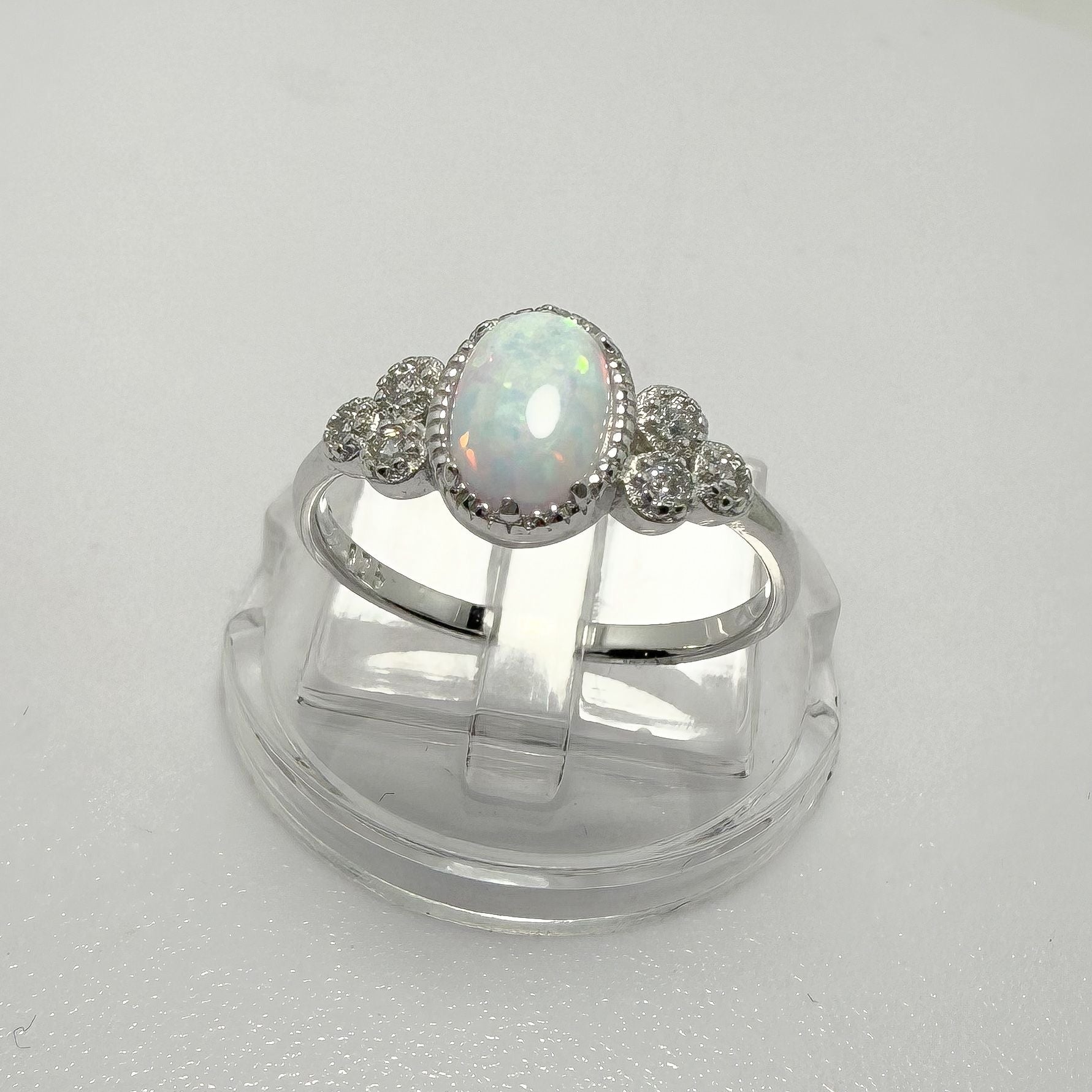 Es un anillo de plata con un diseño elegante y luminoso. En el centro destaca un ópalo grande, redondo y brillante, cuya luz iridiscente capta todas las miradas. La piedra está rodeada por una plata trabajada en forma de entramado delicado, que aporta textura y un toque artesanal. A cada lado del ópalo se disponen tres circonitas blancas muy brillantes, creando un efecto de resplandor que realza aún más la pieza central. Es un anillo lleno de luz, sofisticación y encanto natural.
