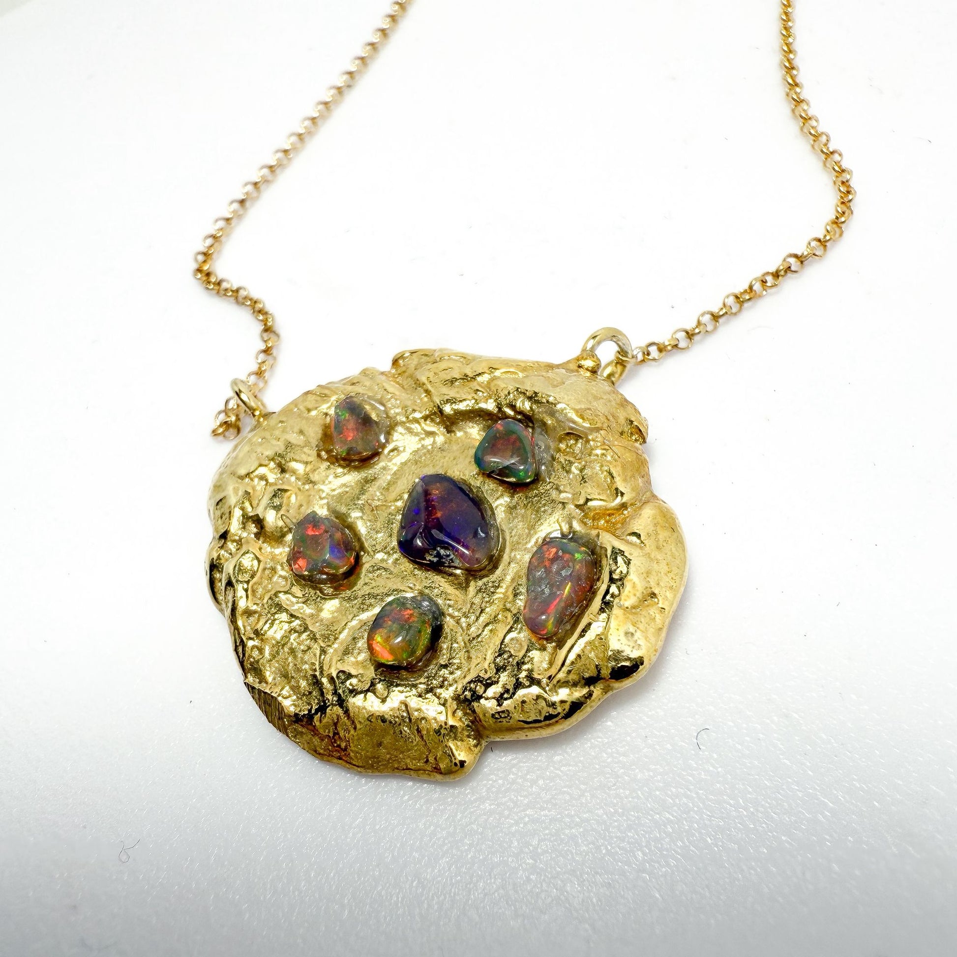 Este original collar de plata de ley con baño de oro destaca por su encantador diseño artesanal que recuerda a una cookie dorada, con textura irregular y aspecto delicioso. Sobre su superficie, varios ópalos naturales están engastados como si fueran pepitas de chocolate, aportando destellos iridiscentes en tonos rojizos, verdes y violetas que hacen de cada mirada una sorpresa.
