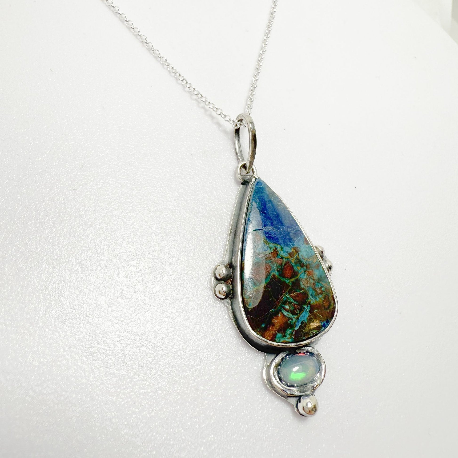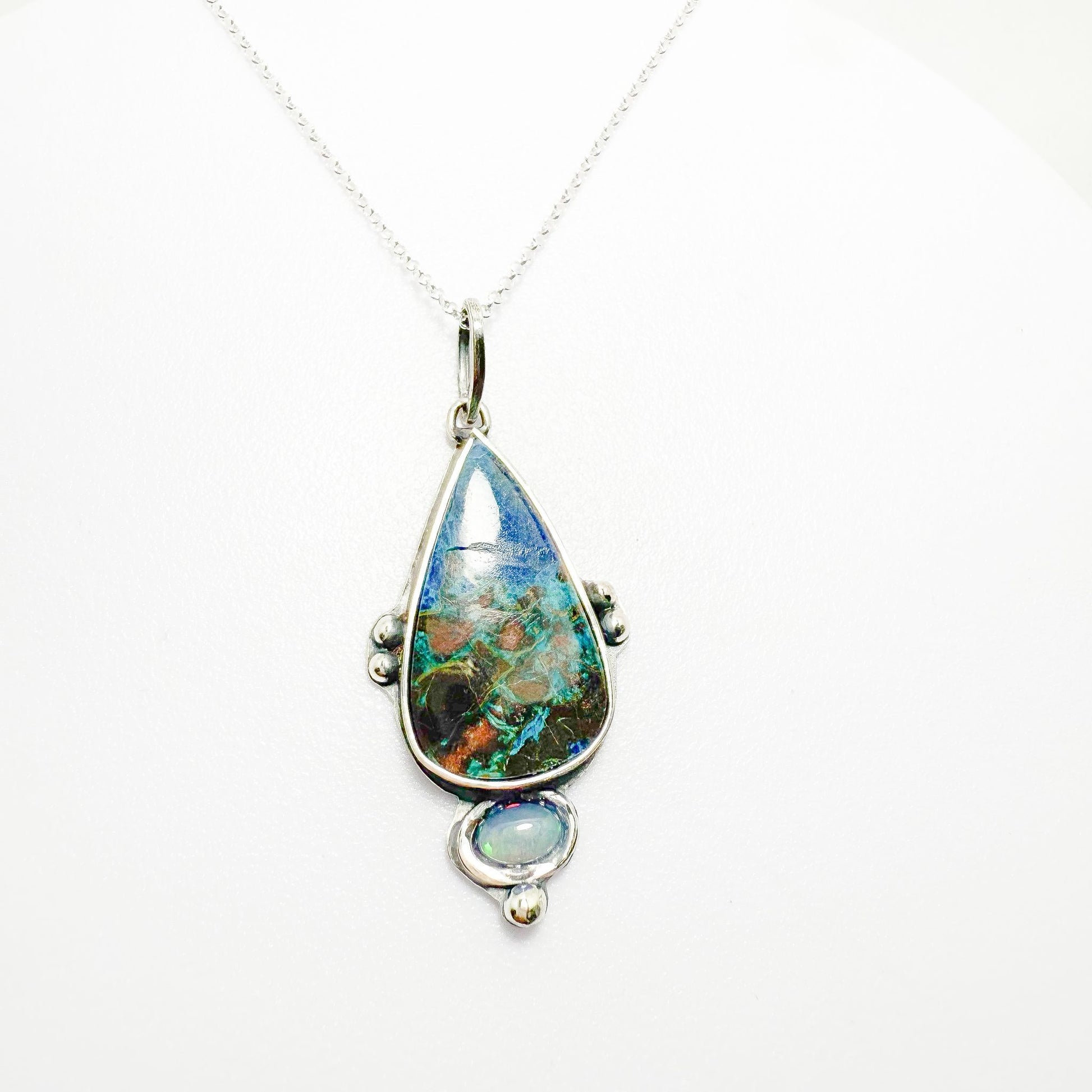 La piedra central, una impresionante shattuckita en forma de gota, despliega una mezcla cautivadora de azules profundos, verdes minerales y vetas tierra que evocan paisajes místicos y antiguos oasis. Debajo, un ópalo de reflejos iridiscentes aporta un toque etéreo y sagrado, como un símbolo de luz divina.
