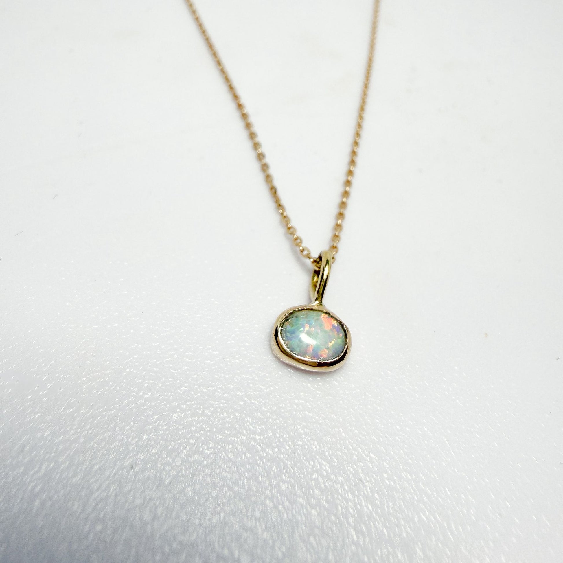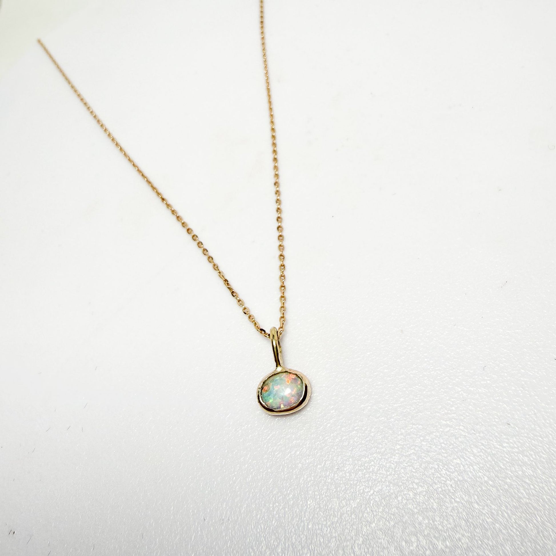 Este delicado colgante está elaborado en oro, engastando cuidadosamente un ópalo natural de tonos iridiscentes que brillan con destellos rosados, verdes y azules. Su diseño minimalista realza la belleza única de la gema, permitiendo que toda la atención recaiga en su luz interior y en sus colores cambiantes.