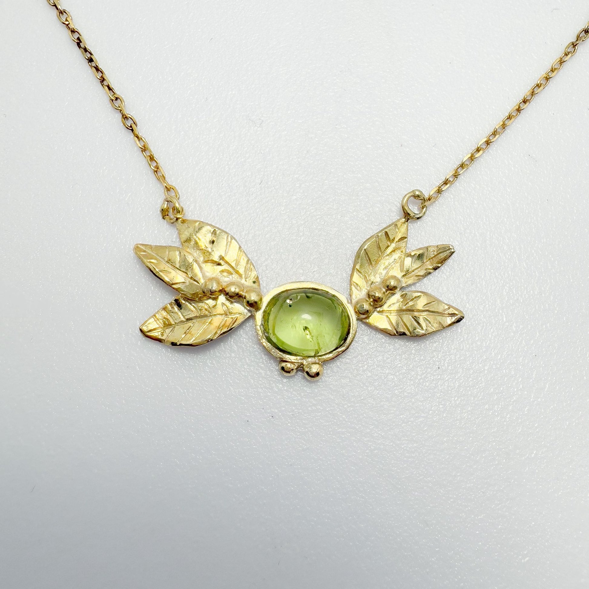 Es un collar de plata de ley bañada en oro de 18 quilates inspirado en la magia del bosque. La pieza central es una piedra esférica de peridoto verde, rodeada en la parte superior por tres hojas doradas a cada lado y adornada con varias pequeñas perlas, que aportan un toque de delicadeza y encanto natural.