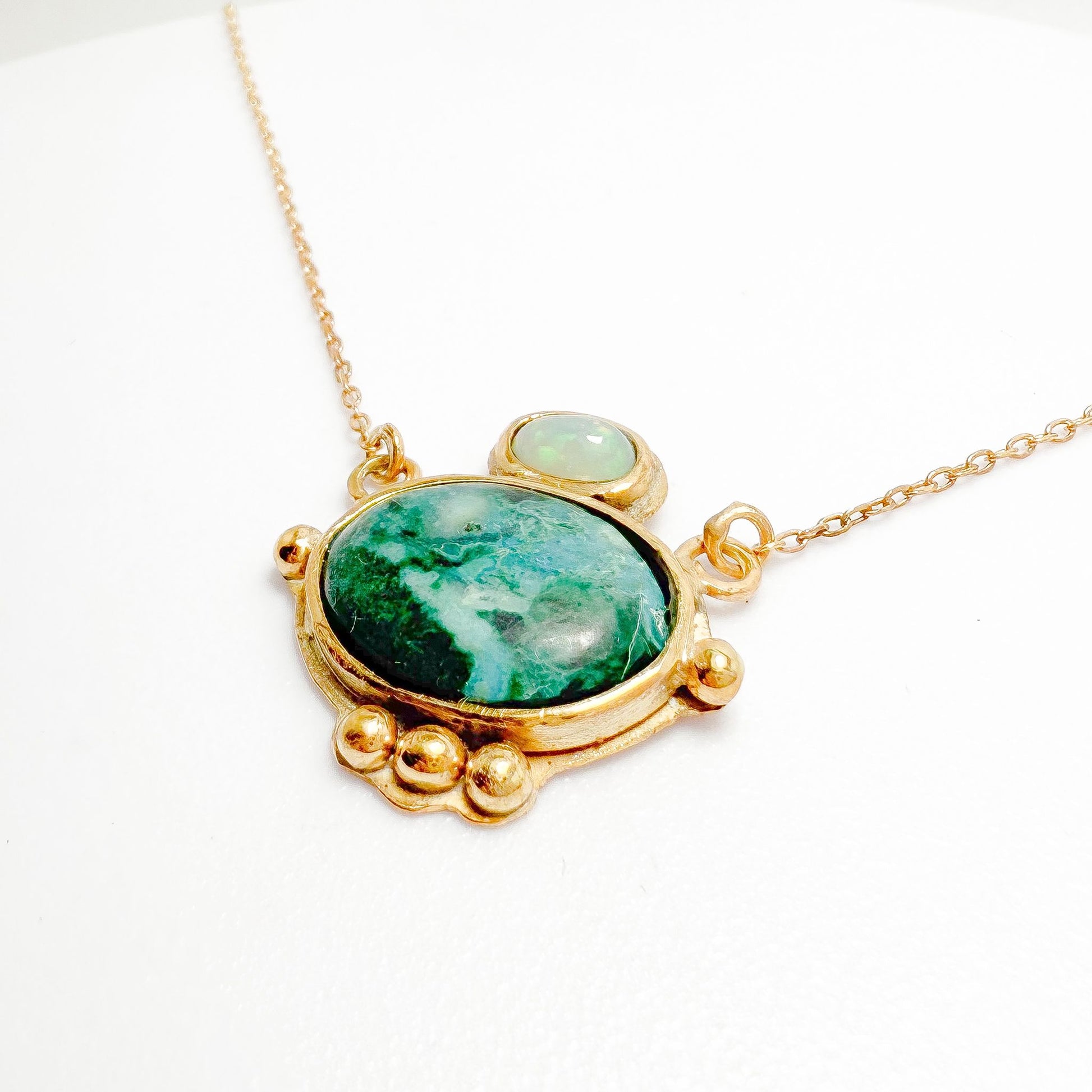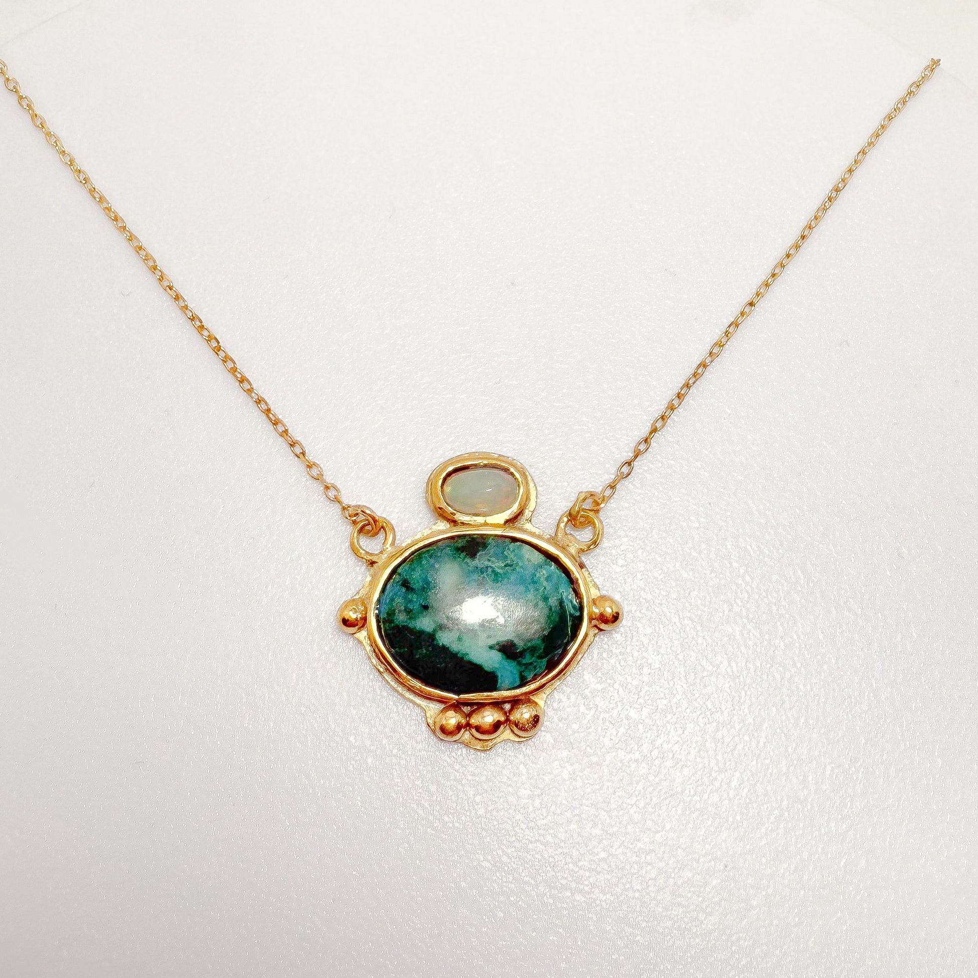 En el centro destaca una hermosa shattuckita, con su inconfundible mezcla de verdes profundos y tonos turquesa que recuerdan a antiguos oasis y templos ocultos entre las dunas. Sobre ella, un ópalo natural aporta un brillo sutil e iridiscente, como una luz divina que corona el diseño.