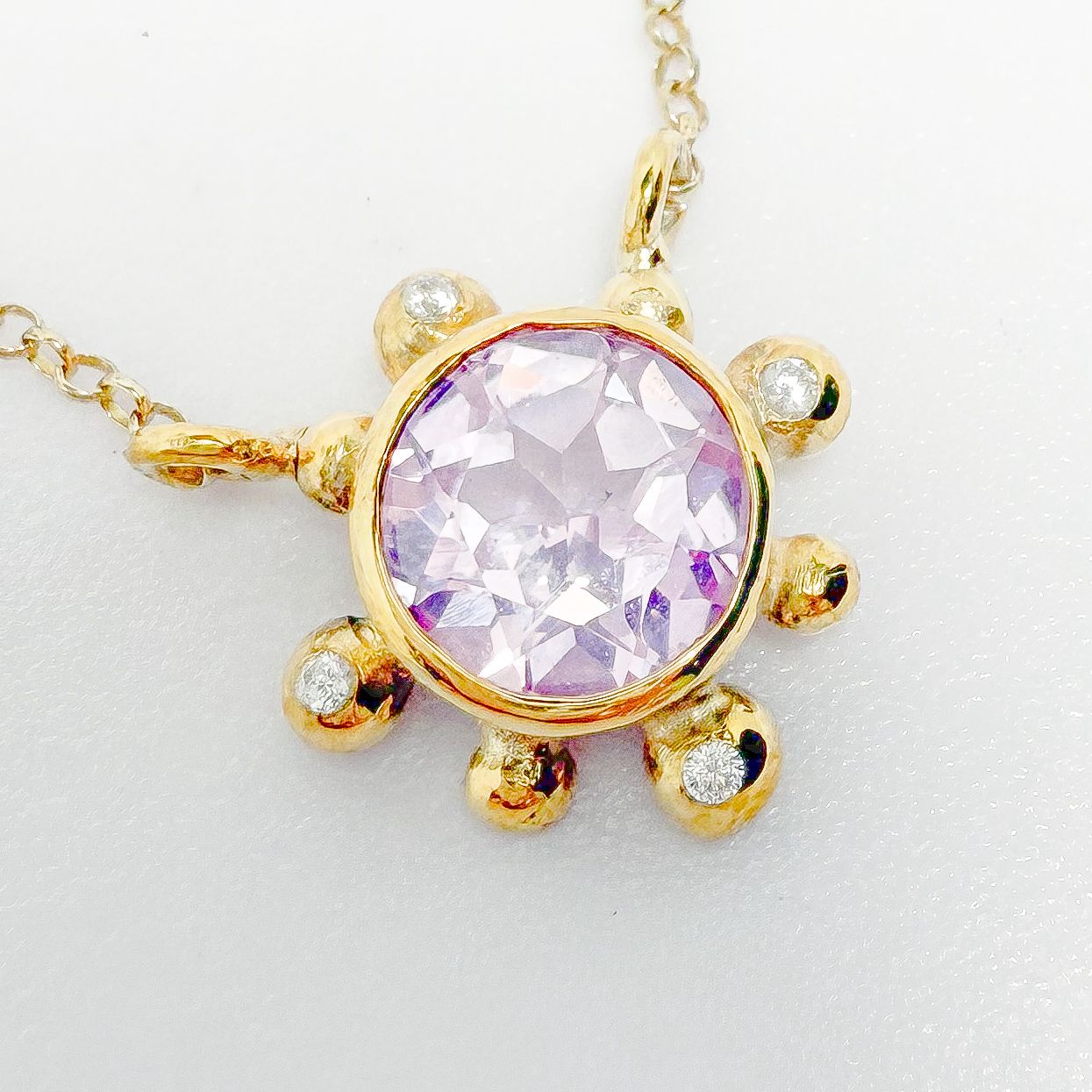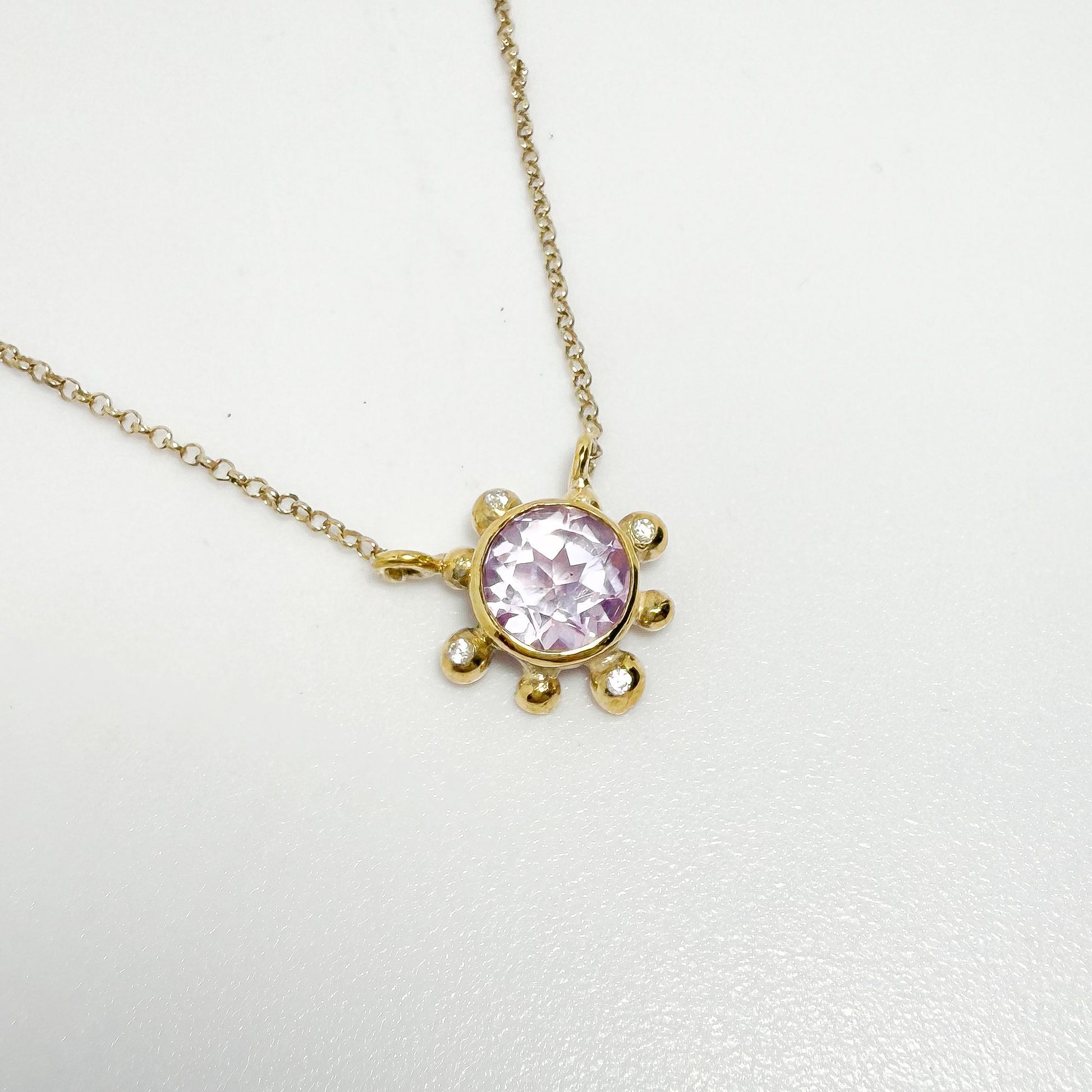 Es un collar de plata de ley bañada en oro con un diseño parecido un timón, símbolo de guía y equilibrio. La pieza central es una turmalina rosa ovalada, rodeada por un delicado marco dorado con circonitas blancas incrustadas, que aportan brillo y sofisticación.