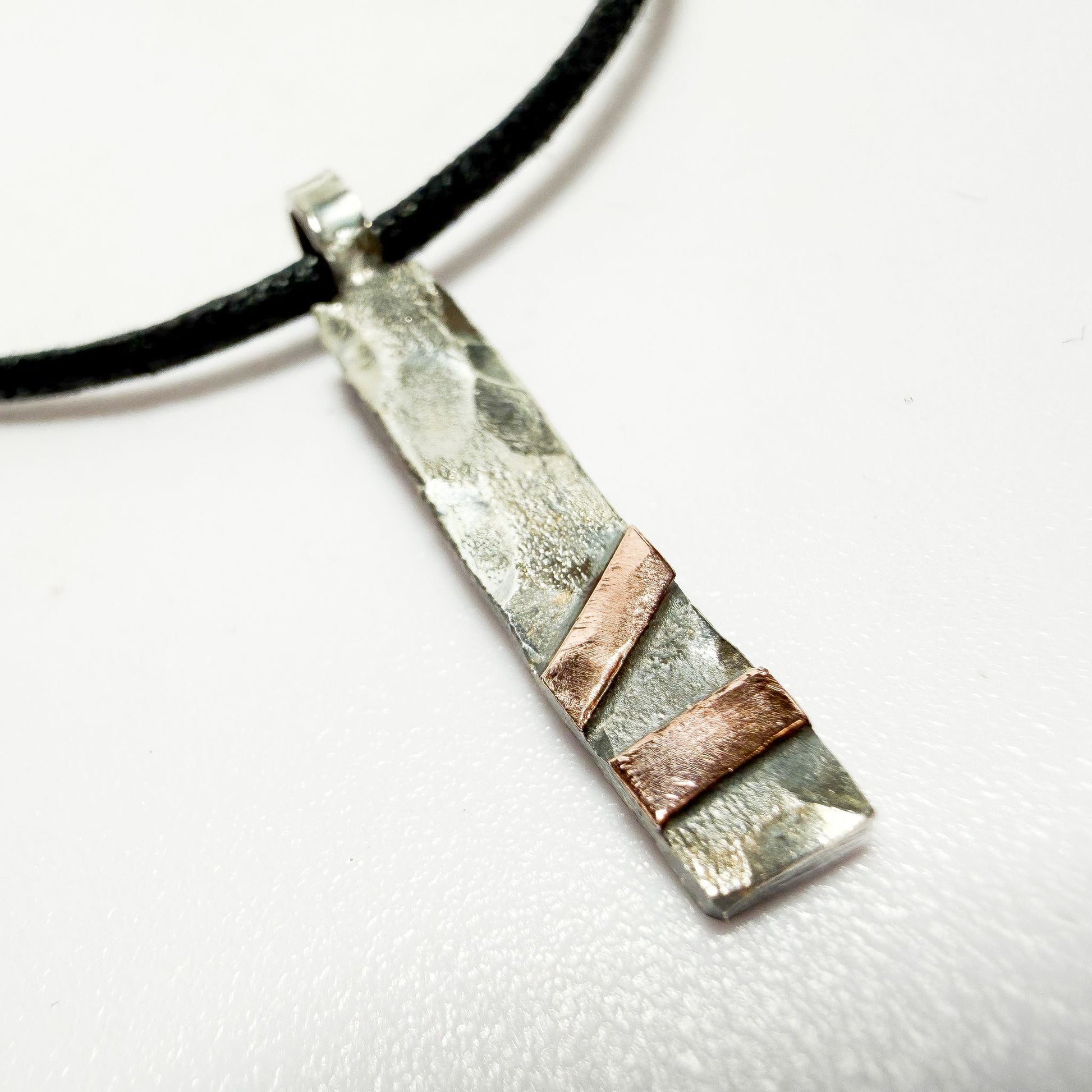 Dos piezas geométricas en metal de tono cálido atraviesan el colgante creando un contraste elegante entre la plata y el acabado bronce. Este juego de materiales aporta equilibrio, modernidad y un toque distintivo sin perder la sobriedad masculina.