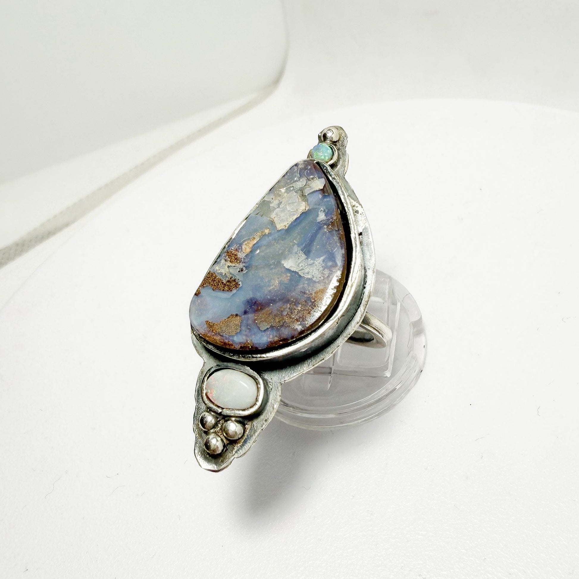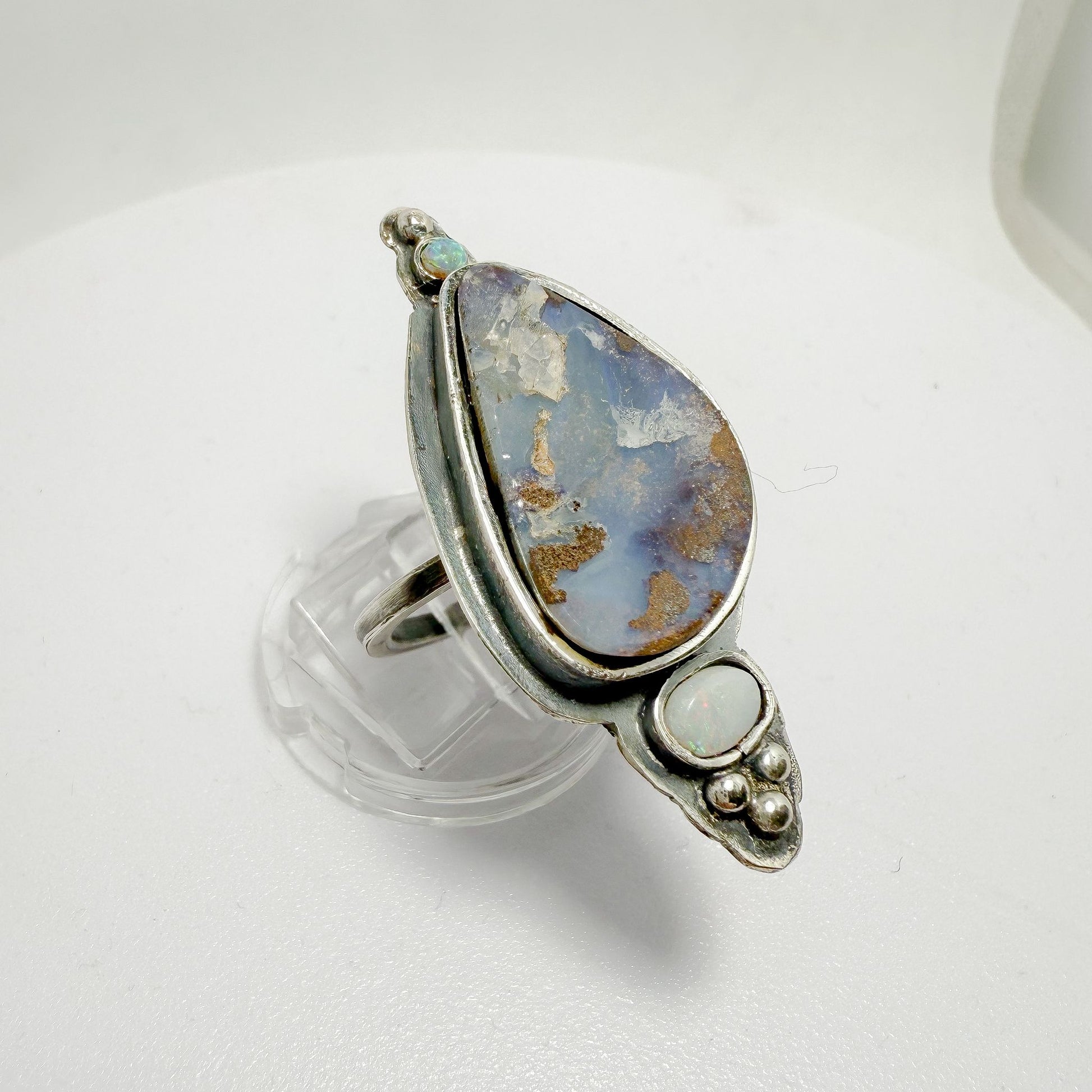 Este anillo exclusivo está elaborado a mano en plata de ley y realzado con tres ópalos naturales en distintas variantes, cada uno aportando su propio carácter y brillo. La piedra central, de forma orgánica y tonos etéreos que fusionan azul, blanco y matices tierra, se complementa con dos ópalos adicionales de brillo sutil e iridiscente, creando una composición equilibrada y llena de personalidad.