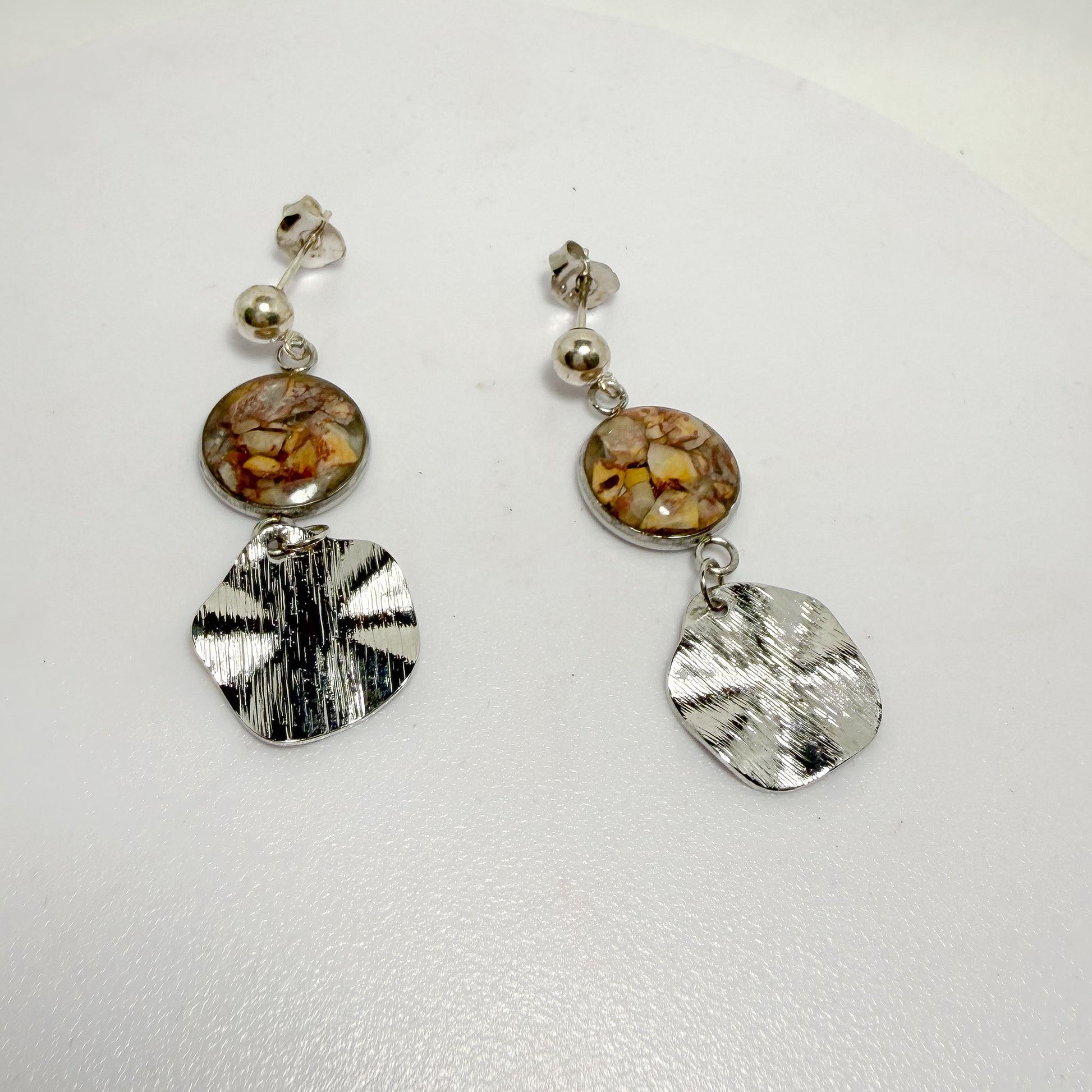 Estos pendientes artesanales combinan la belleza natural de la piedra de la Cinta —mineral autóctono de la zona de Tortosa— con la luz atemporal de la plata de ley.