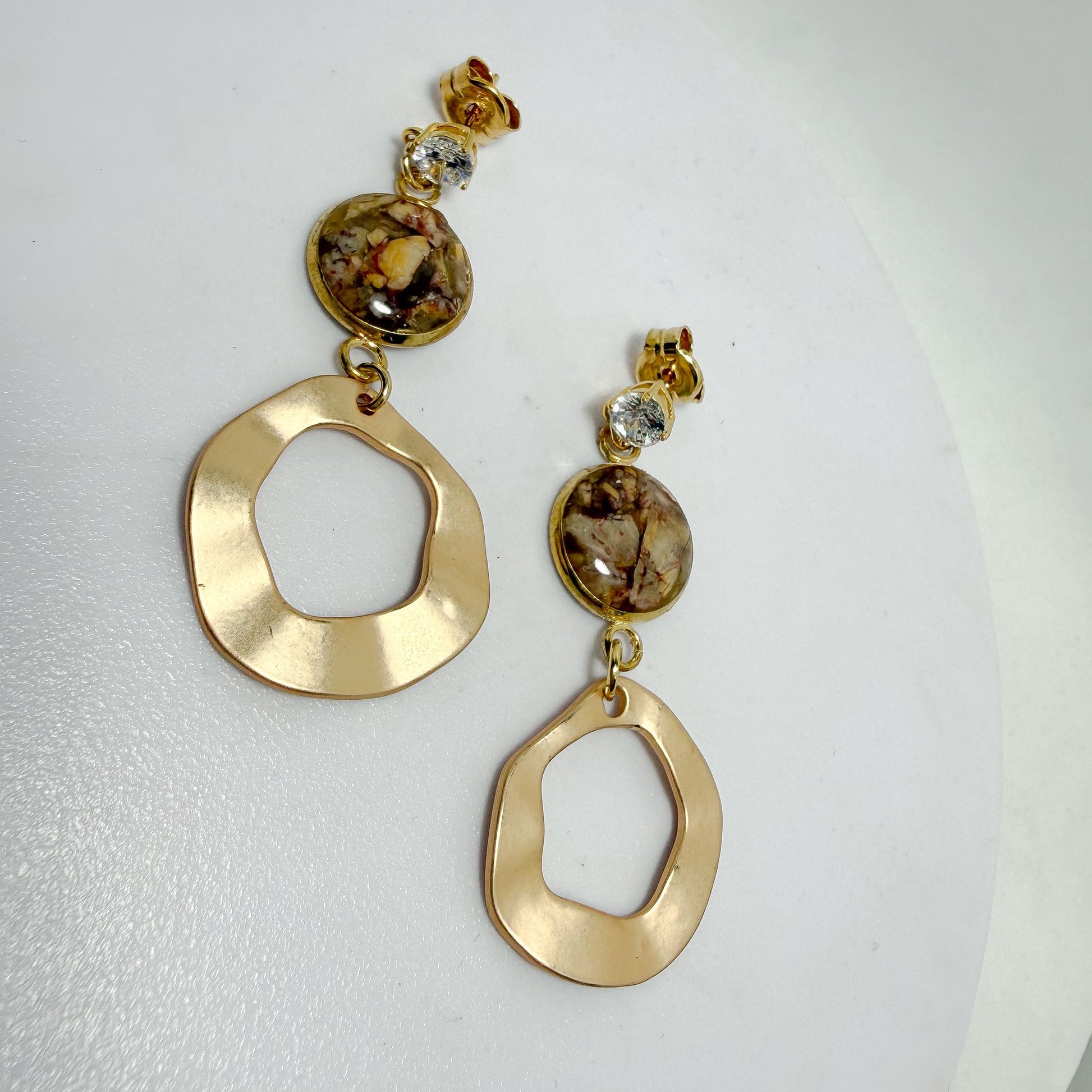 Su diseño colgante y la textura suave del metal dorado hacen de estos pendientes un accesorio versátil, elegante y lleno de personalidad. Cada par es irrepetible, ya que cada piedra posee un dibujo natural único.