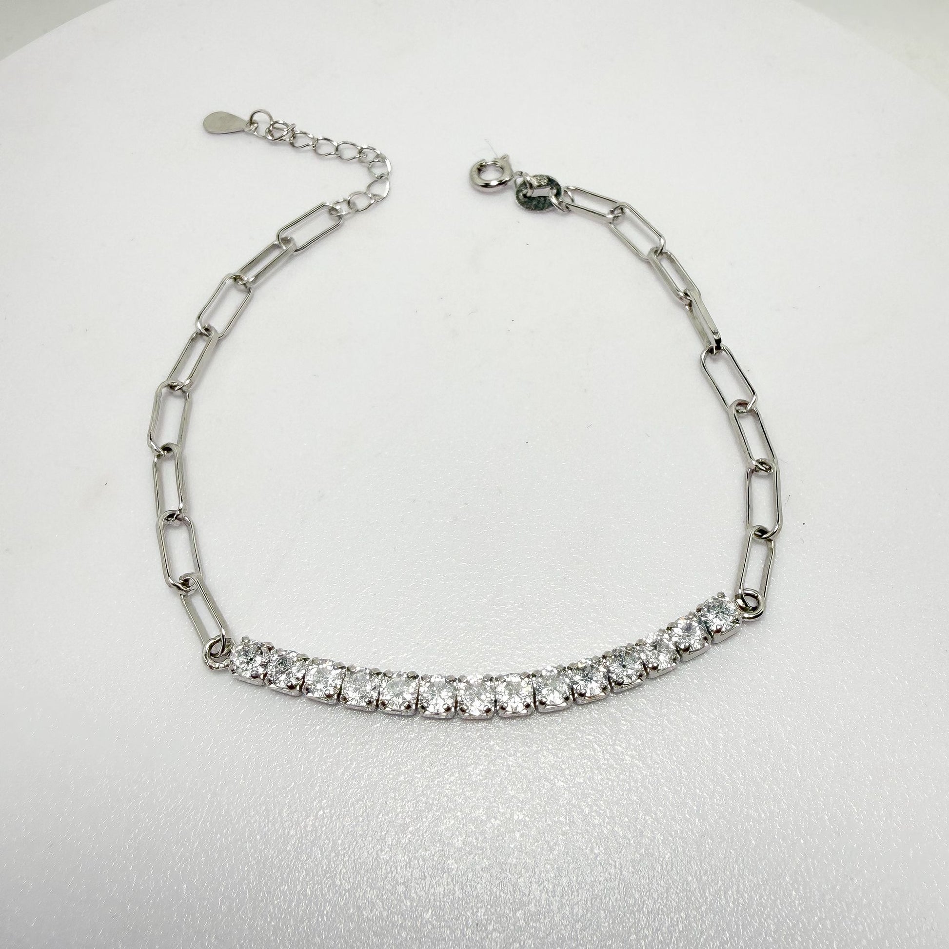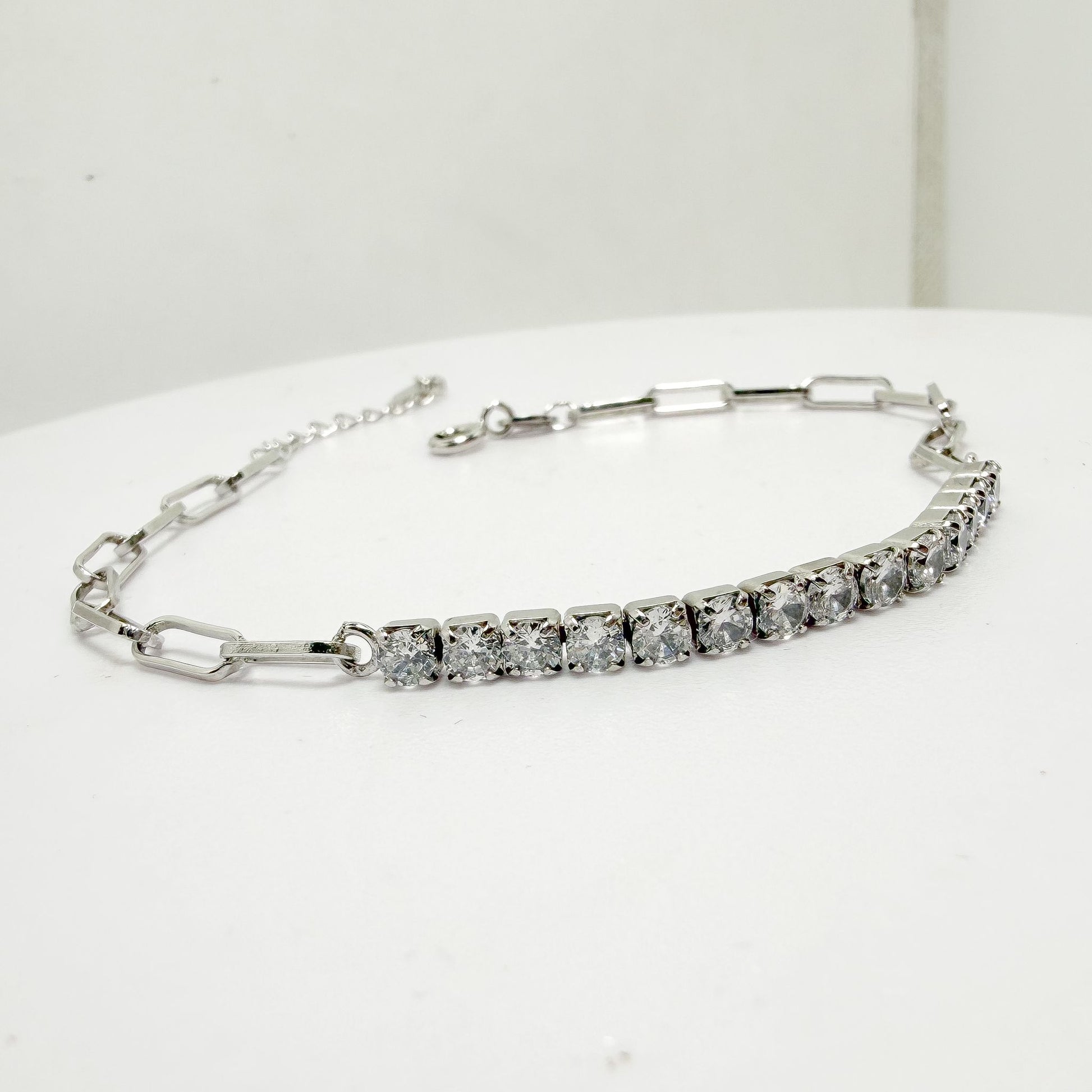 El contraste entre la simplicidad de los eslabones y el destello intenso de las circonitas crea una pieza equilibrada, versátil y perfecta para llevar tanto a diario como en ocasiones especiales. Su cierre ajustable permite adaptarla cómodamente a la muñeca.