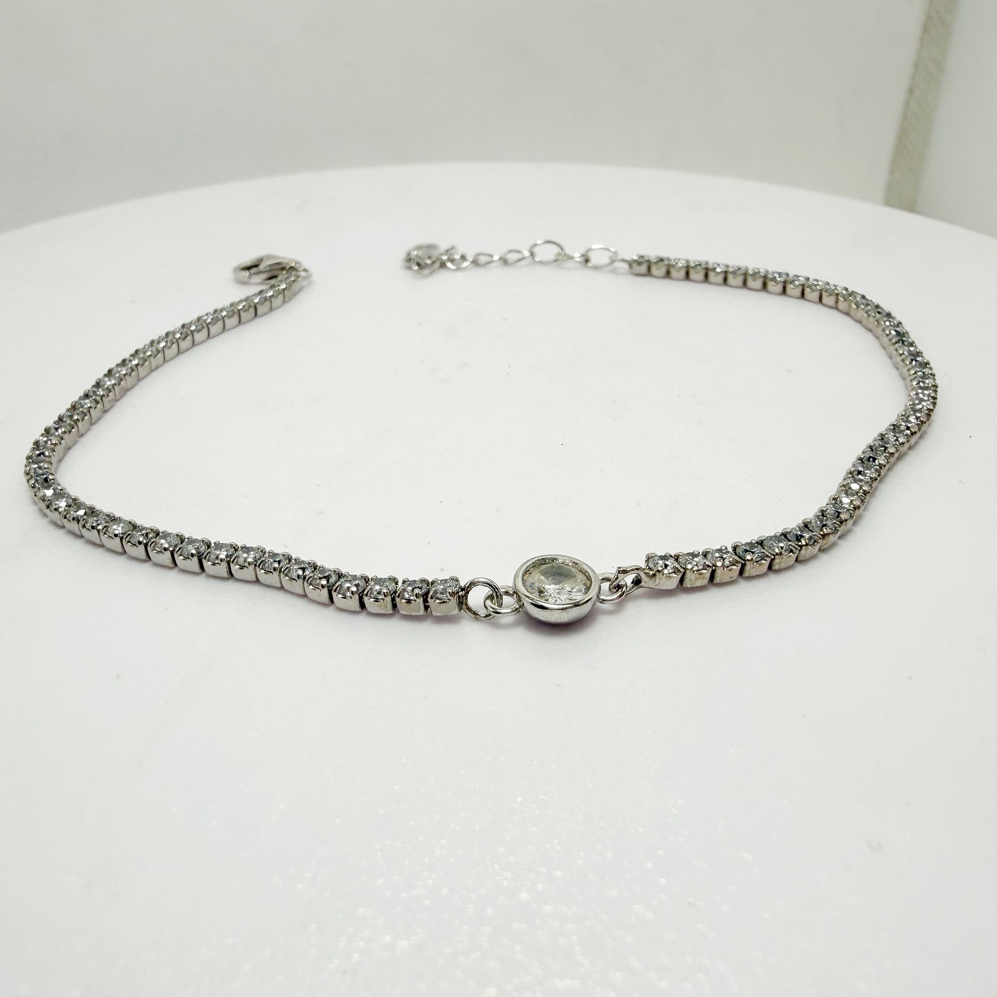En el centro, una circonita de mayor tamaño se convierte en el punto focal, aportando un toque de distinción y realce que armoniza a la perfección con la línea de circonitas más pequeñas que la acompañan. El resultado es una pulsera fina, elegante y versátil, perfecta tanto para el día a día como para ocasiones especiales.