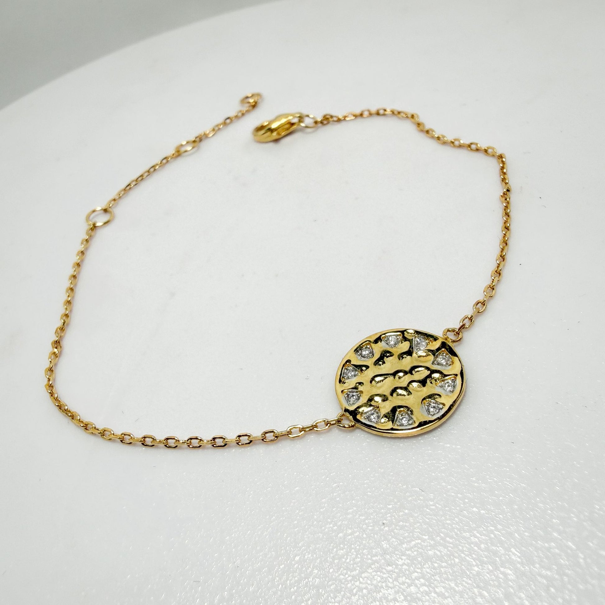 Esta pulsera está elaborada en plata de ley bañada en oro, combinando delicadeza y estilo contemporáneo. Su diseño destaca por un medallón central con textura orgánica, que aporta profundidad y un toque artesanal a la pieza.